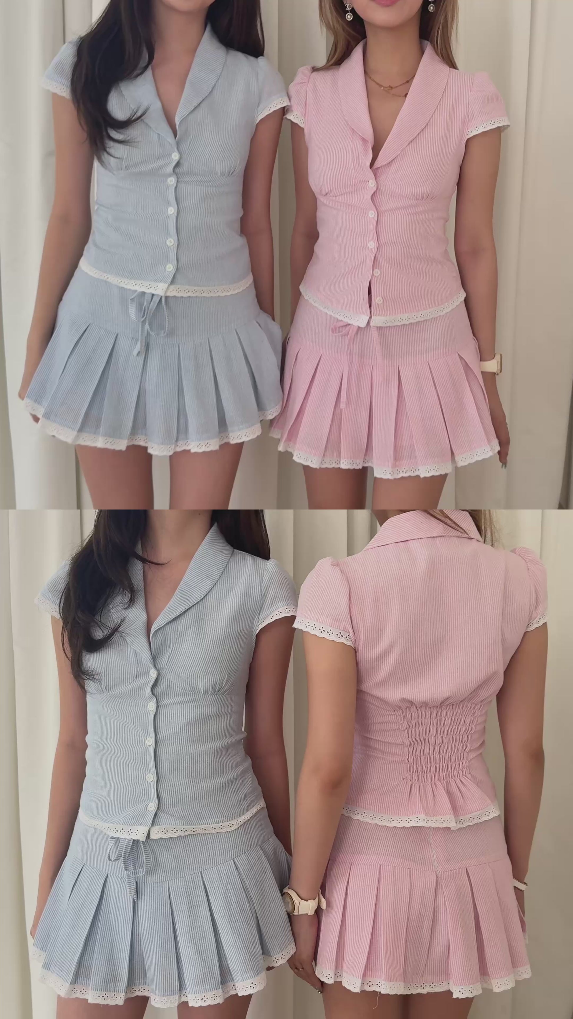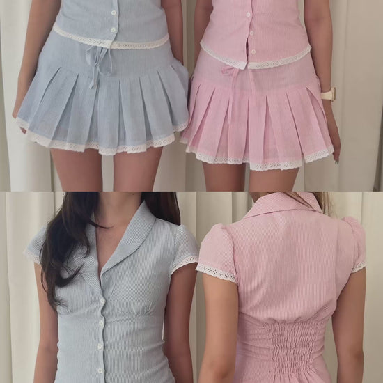 A sweet, flattering matching set designed to feel feminine and effortless. The polo-style top features a soft collar and a ruched back that cinches you perfectly, creating a silhouette that hugs in all the right places.